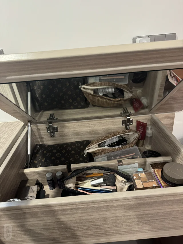 但当你真正的入手翻盖化妆桌之后,你会发现他真的很鸡肋,大瓶的化妆品根本收纳不到柜子中,只能堆积在台面上,导致翻盖化妆桌,永远都乱糟糟的。